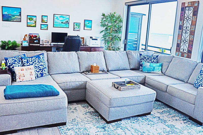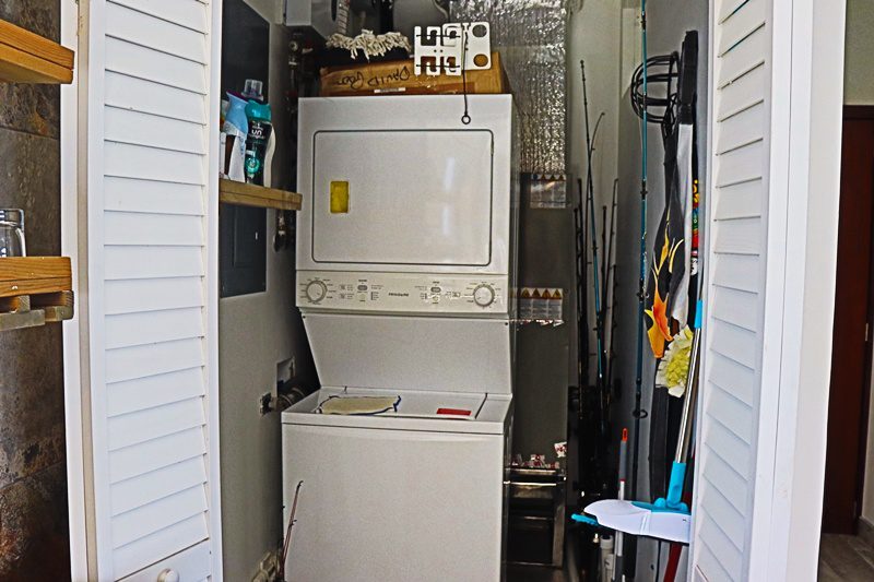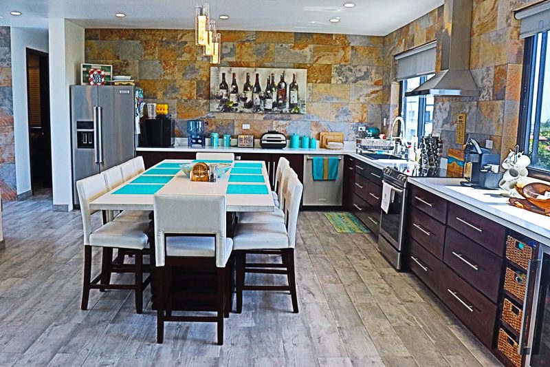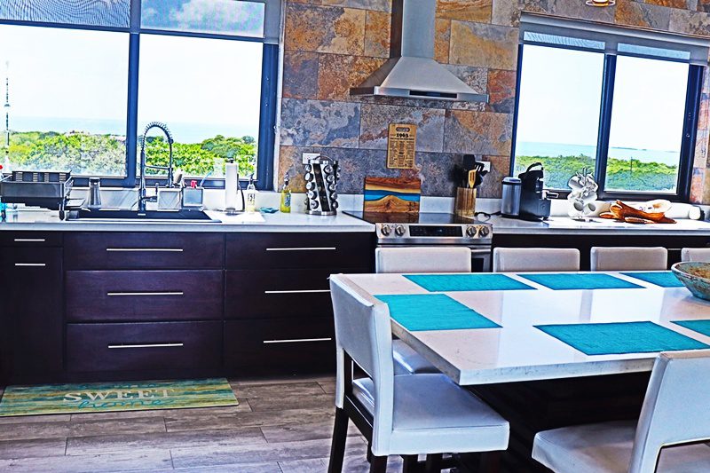 The chef’s kitchen is expansive, with white quartz countertops, ample storage and stunning sea views, while the dining area offers space and ambiance for hosting. The table seats 10! An office nook with water views provides a serene work-from-home setup, and the convenient laundry/storage room adds everyday ease.